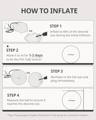 EASY INFLATION- Trideer exercise ball comes with a quick inflation pump (45/55/65cm equipped with a hand pump; 75/85cm equipped with a foot pump), 2 air stoppers, and detailed instructions; available in 5 sizes to meet all your needs.